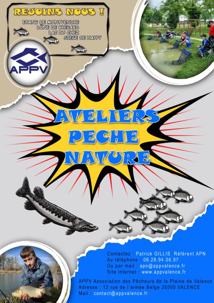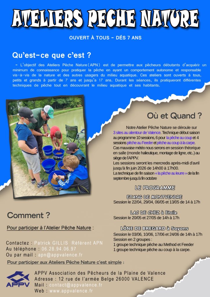 Pour la 6ème année consécutive l’association des pêcheurs de la plaine de Valence (APPV) reconduit son atelier pêche nature (APN) pour les enfants âgés de 7 à 17 ans tous les mercredis à partir du mercredi 22 avril 2026 au 24 juin 2026 pour la pêche au coup et du 30/09 au 14/10 pour la pêche au leurre.